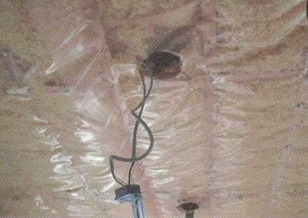 E様から雨漏りの連絡がありました。小屋裏を調べてみますと、電気配線が防湿、気密層を破っていることが分かりました。天井断熱でも、5層を明確に区分して計画することの重要性は屋根断熱と同様です。ただし、通気層が小屋根裏換気層とも呼ばれています。天井断熱で多い不具合は、天井直上工法で、防湿・気密層と断熱層をダウンライトなどの電気配線やダクト配管が破ることによります。電気配線・ダクト配管層が「層」になっておらず、防湿・気密層や断熱層の一部をくりぬいて設けるだけになるからです。断熱材を桁上や桁下に充填する工法にすれば、電気配線・ダクト配管層が明確に区分されるので、防湿・気密層や断熱層の欠損を防止できます。どうしても天井直上工法にしたい場合は、ダウンライトなどの設置個所を箱状にくりぬいて気密処理を入念に施す必要があります。断熱材を小屋裏側から施工する桁上工法と天井直上工法で、ブローイング工法を採用する場合は、小屋裏端部の換気経路を断熱層が塞いで、結露が発生します。換気経路を断熱層と区切る「せき板」の施工が不適切なことによるものです。ブローイング工法では小屋裏端部を吹き残して断熱層に欠損が生じる不具合も小屋裏端部は吹込み用のホースが届きにくいうえ、狭くて作業性が悪く施工状態を確認しづらいのです。さらに繊維系断熱材を使う場合、本来は防風層が必要になりますが、小屋裏でのブローイング作業の邪魔になるという理由で施工していない現場がほとんどです。その点、桁下工法ならばブローイングでも屋内側から不織布シートと合板の間に断熱材を吹き込む方法を採用できます。端部の施工確認が容易で、合板が防風層と屋根断熱で推奨する工法と同様に、合板を透湿防水シートの防水層で天井断熱では、外壁の断熱材の取り合い部分に気流止めを忘れる不具合も少なくありません。気流止めがないと小屋裏の外気が壁体内に浸入して、壁内結露や断熱性能の低下を生じさせるので、注意が必要になります。