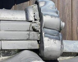 幸いにも鬼瓦の落下ま起きていませんでしたが、写真の通り鬼瓦周辺の漆喰の劣化が分かります。