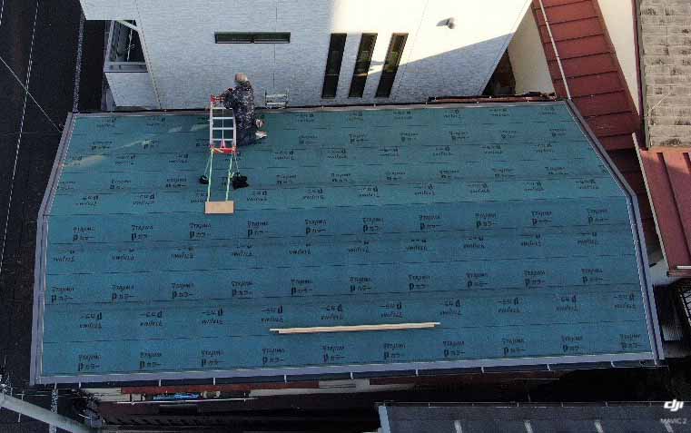 住宅密集地でお隣の建物が迫っている場合は通常道路に面した敷地内にハシゴをかけて屋根調査を行うのですが、ドローンの導入により通行人やご近所の方にご迷惑をかけずに素早く点検できるようになりました。