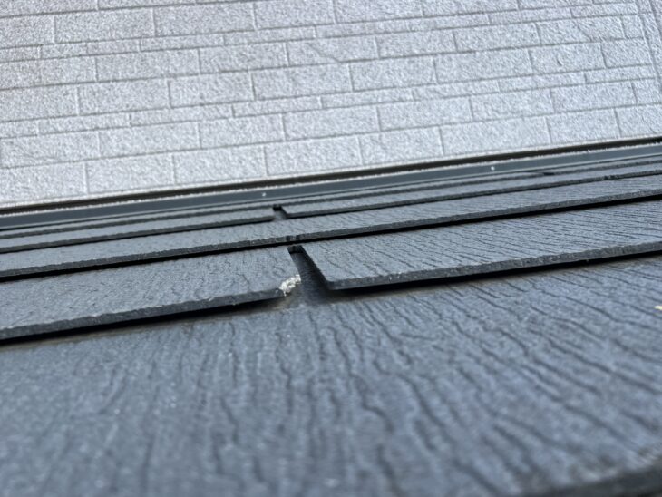 雨漏りは屋根に上ってみないと分からない事がたくさんありますが、こちらでも屋根材の浮きと小さな欠けが確認できます。
