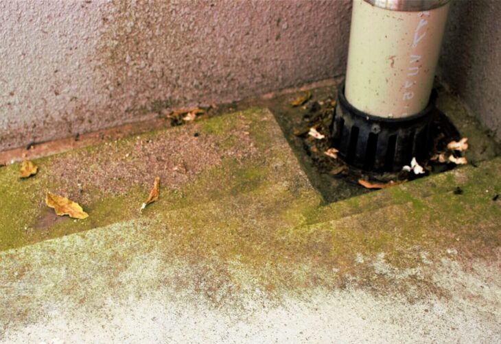 原因はベランダの排水溝がつまっており、全体的に苔なども発生し経年劣化進行しておりました。
