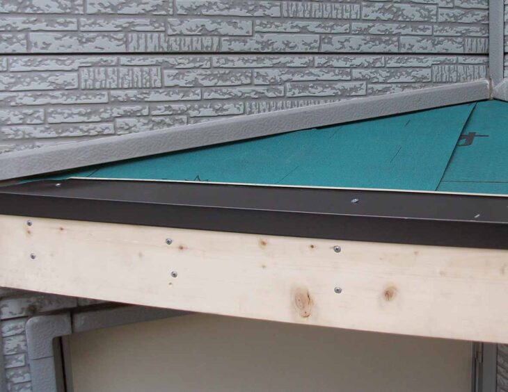 庇の勾配をとった後、腐食していた野地板を交換、ガルバリウム鋼板で施工します。