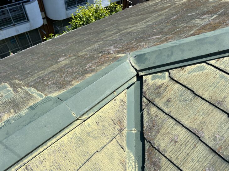 屋根をチェックする時は、屋根材の劣化、ズレや亀裂、色あせや変色、クギの浮きやサビ、コケや植物が生えているか、棟板金の不具合などをチェックしていきます。