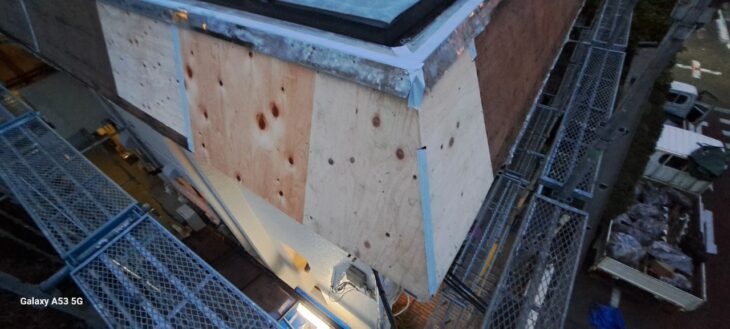 下地合板の上に、**新しい金属製サイディング材(または金属屋根材の立ち上がり用部材)**を取り付けました。