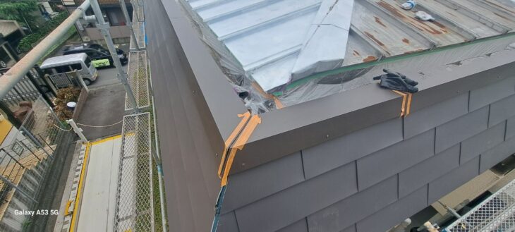 この工事は、老朽化が著しかった建物の屋根とパラペット部分に対して、下地補強、防水処理の徹底を行った上で、耐久性の高い金属製外装材を用いたカバー工法または全面改修を実施したものです。これにより、建物の防水性能、耐久性、そして美観が大幅に向上しました。