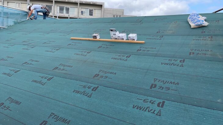 既存の屋根材を撤去した後、新しい屋根材を葺く前に、野地板の上に防水シート(下葺き材、ルーフィング)が敷かれています。「TAJIMA Pカラー」と印刷された緑色のルーフィング材が確認できます。これは田島ルーフィング製の改質アスファルトルーフィングなどで、優れた防水性と耐久性を持つ、現在の屋根工事で一般的に使用されている高性能な防水シートです。この工程が、屋根の雨漏りを防ぐ最も重要な役割を果たします。