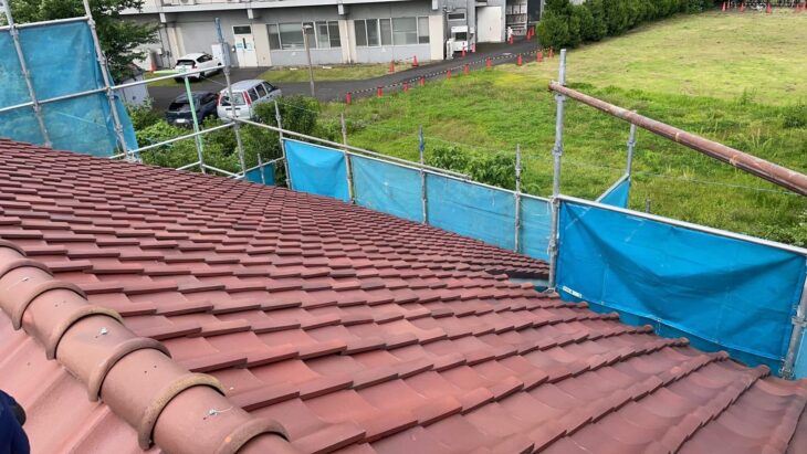 まず、元の屋根材である赤褐色のS字型(スパニッシュ風)の瓦を撤去します。瓦は非常に重く、撤去後の屋根下地(野地板)は、瓦の下に敷かれていた**古い防水シートや杉皮(木片)**がむき出しになり、経年劣化による剥がれや穴が確認できます。この状態から、屋根の防水機能が著しく低下していたことが分かります。
