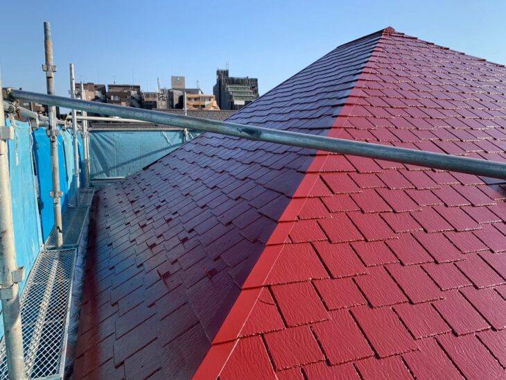 鮮やかな色彩の復活: 深い赤色が均一に塗られ、新品同様の美しい外観を取り戻しています。この鮮やかな色は、塗料が屋根材をしっかりと覆い、紫外線や雨水から守る強固な塗膜が形成されたことを示しています。