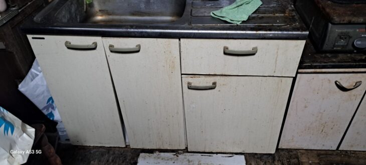この古き良きアパートの一室にある台所は、長年の暮らしの歴史を深く刻んでいました。シンク周りは、水アカや油汚れが蓄積し、全体的にくたびれた印象です。特に目につくのは、流し台の扉と引き出しの表面。色褪せや歪みが見られ、機能面だけでなく、見た目の老朽化も進んでいるのが明らかでした。
