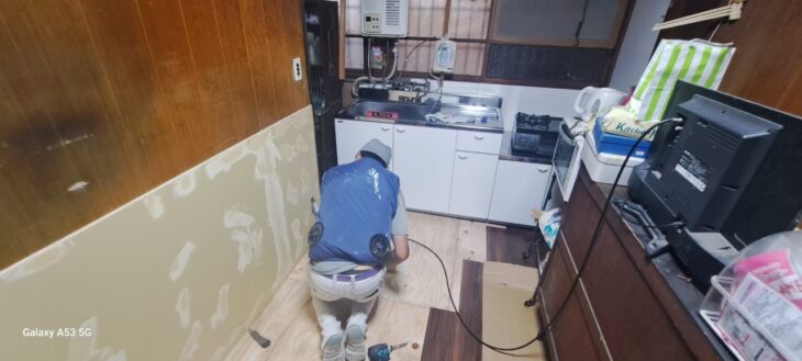 作業初日。まずはその年季の入ったキッチンセットが撤去され、リフォームの準備が始まります。周囲の壁には、新しいボードが貼り、継ぎ目にパテ処理を施します。これは、新しい壁材を貼るための下地づくり。剥き出しになった木材と新しい下地材のコントラストが、まさに「生まれ変わる途中」の活気を感じさせます。床も古材から新しい合板に張り替えられます。