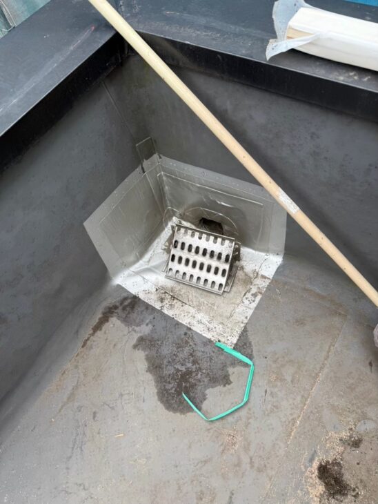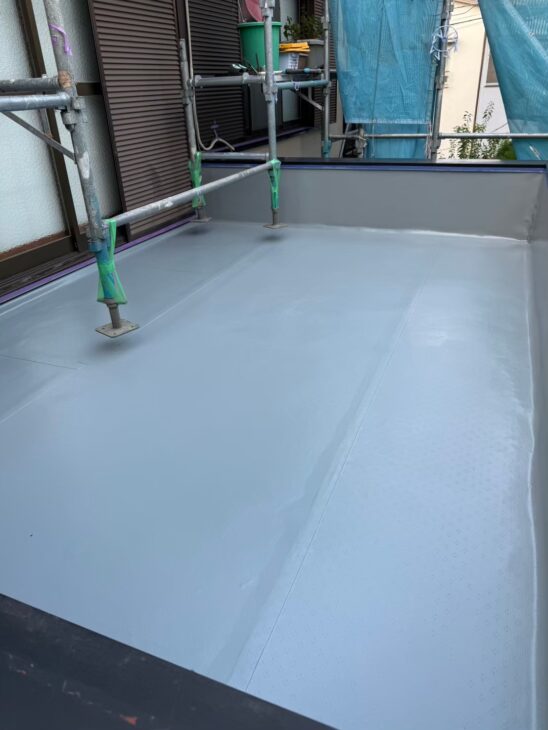特に水が集中する排水口(ドレン)は、建物の内部へ水が浸入するのを防ぐ「防水の要」です。既存の防水層との境目から水が回らないよう、入念な清掃と下地処理を行った上で、新しい防水材がしっかりと密着するように処置を施しました。この作業が、今後の防水機能の寿命を大きく左右します。そしていよいよ、ルーフバルコニーの床面全体に新しい防水工事を施しました。古い防水層の上から下地を整え、ムラなく均一な厚みで防水層を塗布・敷設し全体が継ぎ目の少ない、美しいグレーの強固な層で覆われました。これにより、雨水から建物を守る機能が完全に刷新されています。