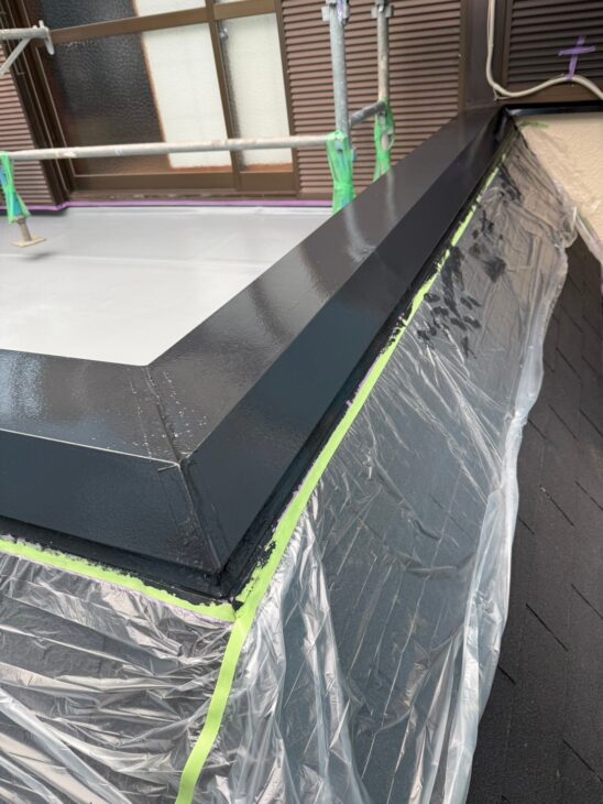 また、ルーフバルコニーの外周にある立ち上がり部分(パラペット)や周辺の屋根材についても、劣化を防ぐための処置を行いました。この立ち上がり部分の鉄部などは、雨風の影響を最も受けやすい箇所です。しっかりと下地調整をした後、耐久性の高い黒色の塗料で丁寧に塗装いたしました。この新しい塗膜が、水の回り込みを防ぎ、防水層と合わせて建物の長期的な保護になります。