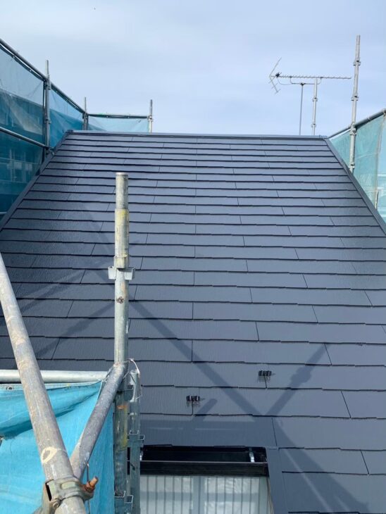 光を鈍く反射する美しい仕上がりは、単なる見た目の美しさだけでなく、強力な撥水・遮熱効果を兼ね備えています。これでもう、これからの台風シーズンも、照りつける夏の太陽も怖くありません。