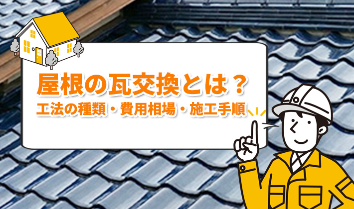 屋根の瓦交換には、部分交換(差し替え)・葺き直し・葺き替え・別素材への変更の4種類の工法があります。破損が一部に限られ下地が健全であれば1日程度の部分交換で対応できますが、雨漏りが発生していたり広範囲に劣化が進んでいたりする場合は葺き直しや葺き替えが必要です。