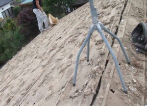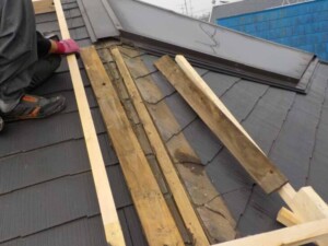 狛江市Y様邸では天井部分がに雨染みが確認でき雨漏りに悩まされているとの事です。 瓦棒葺き屋根を調べてみると心木がボロボロになっており野地板にも影響が出ていました。 釘も浮いおり金属板がずれたり飛散してしまうと2次被害の可 …